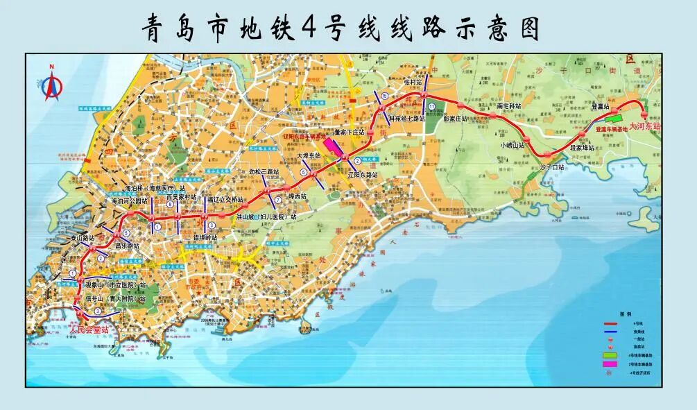 4号线西起人民会堂,东至大河东崂山风景区,全长约31公里,共设25座车站,线路经过前海栈桥风景区、青岛科技街、中央商务区、错埠岭居住区、浮山后居住区、崂山科技城、沙子口片区及崂山风景区等重要片区,通达11所学校、8家医院,是一条名副其实的教育线、医疗线、旅游线。开通后将极大缓解主城区交通拥堵,对提升公共交通吸引力、提升城市功能品质具有重要意义。